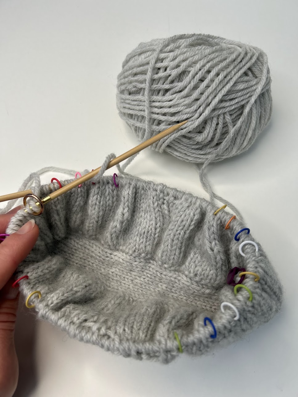 – Introduktion til opbyggelse af tasken strikket med dobbeltstrik med mønsterstrik